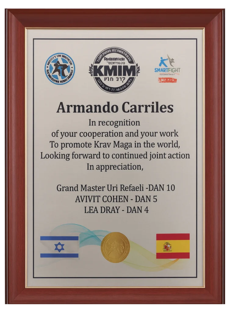 - Placa de reconocimiento (2018) por su contribución al Krav Magá mundial.
